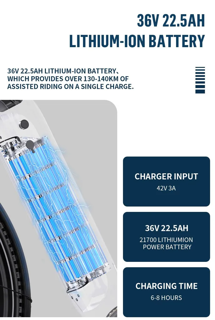 Der 36V 22,5Ah Lithium-Ionen-Akku (810Wh) bietet eine beeindruckende Reichweite von bis zu 140 km pro Ladung. Ausgestattet mit hochwertigen 21700-Zellen und einem 42V 3A-Schnellladegerät – eine vollständige Aufladung dauert nur 6–8 Stunden. Perfekt für intensiven Pendelverkehr oder Wochenendausflüge.