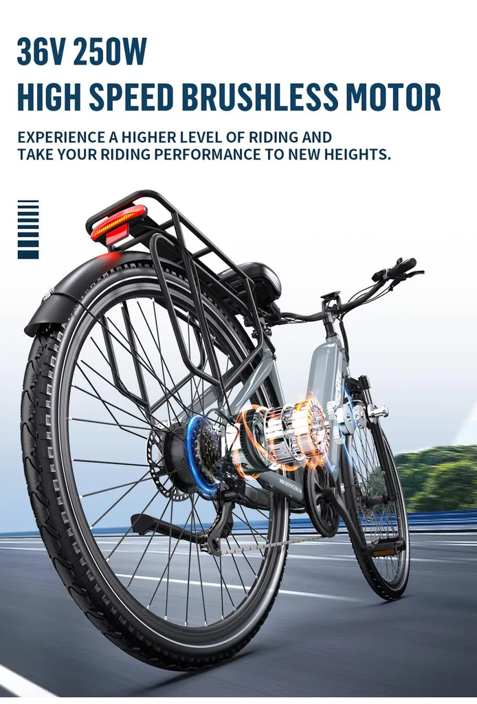 • Dieses E-Bike ist dein idealer Begleiter für Stadtverkehr und lange Touren, gebaut mit einem leichten und stabilen Aluminiumrahmen, der Komfort und Langlebigkeit vereint. ????️????️