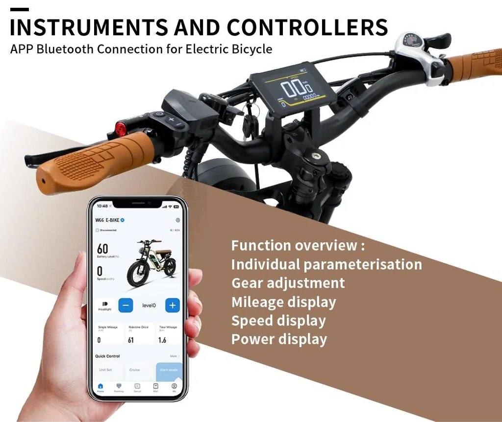 Zusätzliche Features, die das W66 bietet, incluyen ein Bluetooth-fähiges Fahrerlebnis, was Ihnen ermöglicht, das Fahrrad mit einer dedizierten App zu verbinden. Sie können dadurch Details zu Geschwindigkeit, Batteriestatus und zurückgelegter Strecke erfassen.